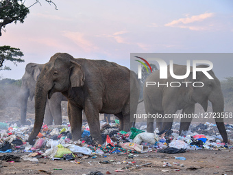 A group of wild elephants forages through a garbage dump in Tissamaharama, Sri Lanka, on September 6, 2025, highlighting the escalating conflict between wildlife and human waste. The scene underscores the urgent need for sustainable waste management and wildlife conservation.