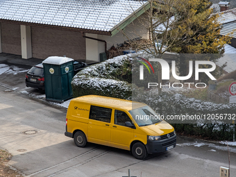 A Deutsche Post van delivers letters and parcels in rural Gmund at Tegernsee Lake in Gmund am Tegernsee, Miesbach, Upper Bavaria, Bavaria, Germany, on February 15, 2025.