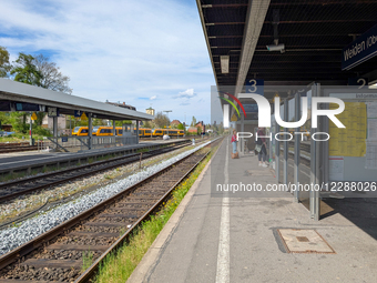 Passengers stand and wait under the shelter on platforms 2 and 3 at Weiden train station, as several yellow Oberpfalzbahn regional trains are parked on adjacent tracks in Weiden, Upper Palatinate, Bavaria, Germany, on April 20, 2025. The platforms are equipped with information boards, signage, and shelters for travelers.