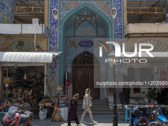 Two Iranian women are walking past a mosque in a bazaar in Bushehr, Iran's first nuclear seaport city, located in Bushehr province on the northern coast of the Persian Gulf, 1090km (677 miles) south of Tehran, on April 28, 2024. The Bushehr nuclear power plant, aimed at providing electricity and diversifying energy resources, began construction in 1975 after Iran signed a contract with the German company Siemens. However, the Islamic Revolution in 1979 halted the construction, and Germany ceased work due to political sanctions. After years of delays, Iran reached an agreement with Russia in 2004 to complete the project. The Bushehr nuclear power plant became fully operational and connected to the national electricity grid in 2011, marking it as Iran's first and only active nuclear power plant.