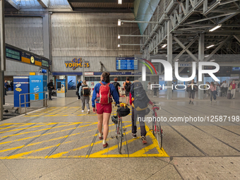 Two cyclists with backpacks walk their bicycles through the main hall of Munich Main Station in Munich, Bavaria, Germany, on July 19, 2025. The station is a major transportation hub for regional and long-distance travel across Germany and Europe.
