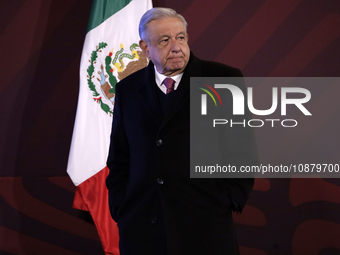 The President of Mexico, Andres Manuel Lopez Obrador, is announcing the start of operations of the Mega Farmacia del Bienestar at the press conference at the National Palace in Mexico City, Mexico, on December 29, 2023.