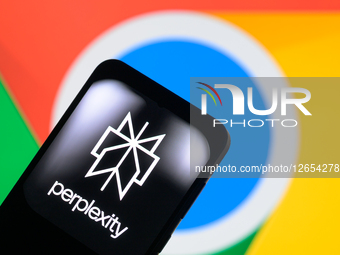 The Perplexity logo is displayed on a mobile phone with the Chrome icon seen in the background in this photo illustration in Brussels, Belgium, on August 17, 2025.