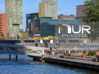 Locals enjoy an early evening at Zwembad Rijnhaven in Rotterdam, Netherlands, on September 7, 2025. It is an open-air swimming location in central Rotterdam between Kop van Zuid and Katendrecht. The swimming area is equipped with a bridge and ladders for entry and exit, and the quay can be used for jumping into the harbor. Steps and platforms around the water provide space for sitting. Visitors use the area for swimming, relaxing, and watching the sunset over the port.