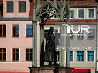 The Market Square (Marktplatz) with the monuments to Melanchthon and Martin Luther and the Church Sankt Marien is pictured in Wittenberg, Germany, on March 21, 2025. The Augustinian friar and priest Martin Luther proposes in 1517 in this city an academic discussion about the practice and efficacy of the sale of indulgences in Ninety-five Theses, starting with this action the Protestant Reformation.