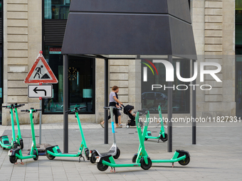 Rental e-scooters park in a pedestrian zone in Hamburg, Germany, on August 26, 2022. A cluster of bright green rental e-scooters is in a pedestrian zone. These e-scooters, part of an eco-friendly and shared mobility system, represent a growing trend in urban transportation solutions. A construction sign and directional arrow in the scene juxtapose the orderly yet spontaneous arrangement of the scooters, highlighting the challenges and opportunities of integrating new mobility services into cityscapes.