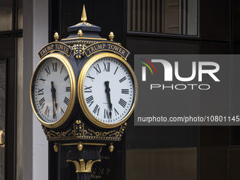 Clock in front of Trump Tower with the logo inscription of Trump tower on it. The main entrance of Trump Tower with the inscription on it and a US flag in New York City in the United States of America. The 58-floor skyscraper is reaching the height of 664 foot tall - 202 m,is a mixed-use condominium skyscraper at the Fifth Avenue in Midtown Manhattan hosts the headquarters for Trump Organization and houses the penthouse residence of the former US President Donald Trump, who is also a businessman and real estate developer. The building was designed by Der Scutt in modernism architecture style with glass and stepped facade at the building, construction began in 1979 in NYC. NYC, USA on May 2023