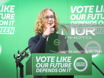 Scottish Greens co-leader Lorna Slater launches the Scottish Greens Scottish election manifesto during an election event held at SWG3 Studio Warehouse on April 14, 2021 in Glasgow, Scotland. Their manifesto contains plans to create over 100,000 jobs as part of its plans for a green recovery that cuts Scotland’s climate emissions.
