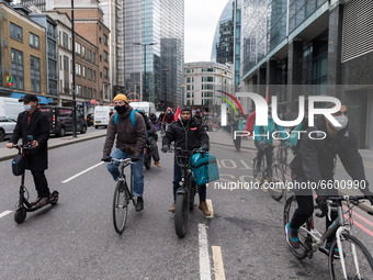 LONDON, UNITED KINGDOM - APRIL 07, 2021: Deliveroo couriers ride through the City of London during a strike action over pay, rights and working conditions on the company's first full trading day after last week’s stock market debut, on 07 April, 2021 in London, England. The takeway food delivery riders are demanding a guaranteed living wage, holiday and sick pay, an end to unpaid waiting times, and the right to refuse unsafe work without penalty.