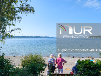 A senior couple stands on the shore of Lake Starnberg in Starnberg, Bavaria, Upper Bavaria, Germany, on June 19, 2025. The lakeside scene features calm waters, sunny weather, and a relaxed summer atmosphere.