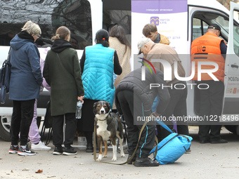 Volunteers of the Martin Club NGO help locals affected by a Russian drone attack in the Central district in Dnipro, Ukraine, on March 29, 2025.