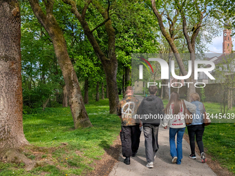Four young people walk along a tree-lined path in a green park, with two of them holding hands, in Straubing, Lower Bavaria, Bavaria, Germany, on April 26, 2025. The group strolls past the old town wall under spring foliage, with a church tower visible in the background.