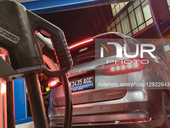 A GLE Mercedes Benz hybrid car while connected to an EV charge station is seen in Briatico, Italy, on September 11th, 2025.