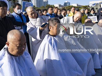 Family members of victims from the December 29 Jeju Air crash at Muan International Airport shave their heads during an emergency press conference across from the presidential office in Yongsan District, Seoul, South Korea, on December 1, 2025. They demand that the Aviation and Railway Accident Investigation Board halt its public hearing. They argue that the board's affiliation with the Ministry of Land, Infrastructure and Transport compromises the independence and credibility of the investigation and call for it to be placed under the prime minister's office as an independent body.