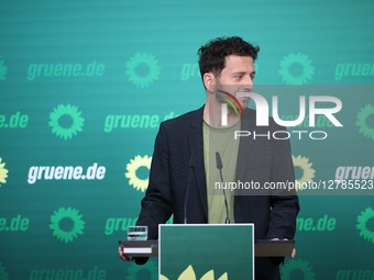 Felix Banaszak, federal Chairwoman of the Green Party/Bundnis 90/Die Grunen, speaks to the media during a press conference in Berlin, Germany, on September 22, 2025.
