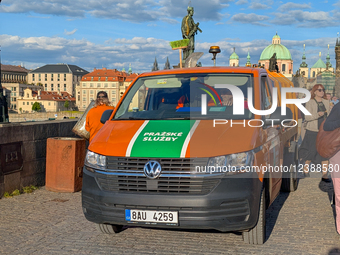 A municipal cleaning vehicle from ''Prazske Sluzby'' with workers in uniform drives across Charles Bridge in Prague, Czech Republic, on May 11, 2025. The service is responsible for waste collection and maintaining cleanliness in the historic center during peak tourist hours.