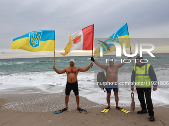 Men swim in the Black Sea during the Epiphany celebration on the Lanzheron beach in Odesa, Ukraine, on January 6, 2025. NO USE RUSSIA. NO USE BELARUS.
