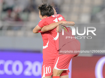 Kim K. Won Sim, number 15, a forward for Korea DPR U-17, celebrates the goal of 1-0 during the FIFA U17 Women's World Cup Morocco 2025 quarter-final match between Korea DPR and Japan in Rabat, Morocco, on November 1, 2025, at the Olympic Stadium.