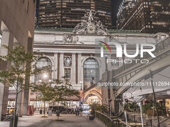 Exterior night view of the Grand Central Terminal or Grand Central GCT, a commuter rail terminal located at 42nd Street and Park Avenue in Midtown Manhattan, New York City, USA. Iconic railway station between the giant modern buildings. The terminal is the third busiest train station in North America and offers local services as well like subway connection. The station was opened in 1913 in Beaux-Arts architectural style by Reed and Stem, Warren and Wetmore. It is an attraction also today as it is registered as a Histroic Landmark. NYC, United Stats of America on May 2023.