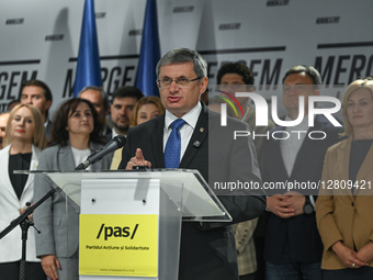 CHISINAU, MOLDOVA - SEPTEMBER 29, 2025: Igor Grosu, leader of the pro-European Party of Action and Solidarity (PAS) and Speaker of Parliament, together with Prime Minister Dorin Recean and other government and party members, speaks to the media during a press conference the day after Moldova's parliamentary elections, in Chisinau, Moldova, on September 29, 2025. With nearly all ballots counted, PAS secured about 50.1% of the vote, ahead of the pro-Russian Patriotic Bloc with 24.2%, giving PAS a clear parliamentary majority and reinforcing Moldova's path toward EU integration.