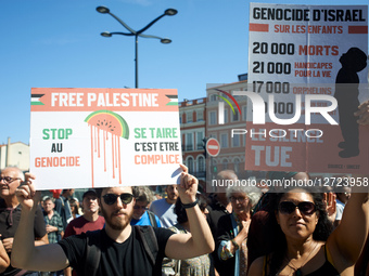 A young woman raises her placard during the protest. A Senior EU official, Tresa Ribera, the European Commission's Executive Vice President, says Israel's war in Gaza is a genocide. In Toulouse, France, on September 9, 2025, people take to the streets to denounce the current Israeli onslaught in Gaza. The Israeli onslaught in Gaza is deemed 'genocide' by the CPI and several NGOs such as Amnesty International, HRW, and PHR. Israel crosses all the red lines of humanitarian laws and even laws of war. No meaningful humanitarian assistance is delivered to Gaza since March 2, and a UN-related global hunger monitor warns that more than a million people face starvation in Gaza. More than 300 Palestinians die of human-made starvation. The US-Israel Gaza Humanitarian Foundation distributes aid, but Israeli forces continue to kill Palestinians when they gather to obtain food. More than 1,000 Palestinians are killed during such distributions. The UN and NGOs do not want to participate as they call it a 'weaponization of Food'. Since October 7, 2023, more than 64,000 Palestinians have been killed in Gaza by the Israeli army.