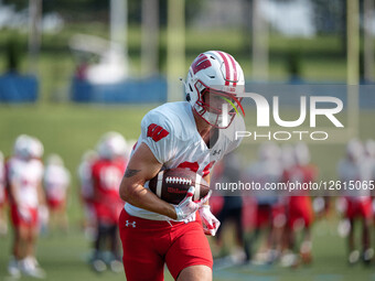 Wisconsin Badgers wide receiver Mason Kelley (81) runs after a catch during training camp at Ralph E. Davis Pioneer Stadium in Platteville, Wisconsin, on August 3, 2025.