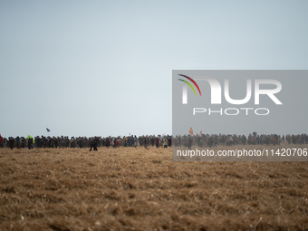 Protesters are marching during a demonstration against the construction of a giant water reservoir (mega-bassine) in Migne-Auxances, western France, on July 19, 2024. Fifteen months after the clashes at Sainte-Soline, several thousand opponents of irrigation reservoirs, who have been gathering in the Deux-Sevres since July 16, 2024, are demonstrating in neighboring Vienne on July 19, despite a ban imposed by the authorities. This ''great march,'' aimed at ''extracting a moratorium'' on the construction of water reservoirs, is leading them to fear ''acts of great violence'': more than 3,000 gendarmes are being mobilized to ''protect'' farms and agricultural installations.