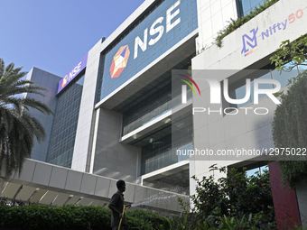 A gardener sprays water in front of the National Stock Exchange during the Lenskart IPO listing ceremony in Mumbai, India, on November 10, 2025.
