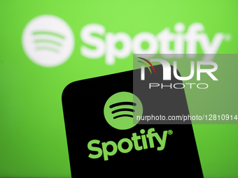 In Creteil, France, on September 29, 2025, the Spotify logo appears on a smartphone with the Spotify logo on a green background in the background. Spotify removes 75 million AI-generated tracks and now requires them to be labeled ''AI generated.'' (Photo Illustration by Samuel Boivin/NurPhoto)