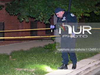 An evidence marker is lying on the ground where shell casings are being discovered at the crime scene. Three people are being shot in Chicago, Illinois, United States, on May 17, 2024. At approximately 7:27 p.m., Friday evening, on the 5500 block of W. Quincy, a 14-year-old male victim, a 15-year-old female victim, and an 18-year-old male victim are near the sidewalk when they are being approached by a black-in-color Kia. One suspect is exiting the vehicle, showing a handgun, and firing shots. All three victims are being transported to the hospital in good condition. There are no suspects in custody.