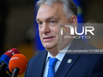 Viktor Orban, Prime Minister of Hungary, addresses the media as he arrives to attend the EU-Western Balkans summit in Brussels, Belgium, on December 17, 2025.