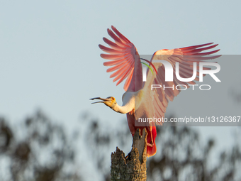 A roseate spoonbill lands in a tree at the Orlando Wetlands in Christmas, Florida, on December 23, 2025. Spoonbills get their striking pink color from the pink pigments in the crustaceans they eat. The Orlando Wetlands is a 1,650-acre park known for its diverse birdlife and restored marsh ecosystem that provides vital habitat for wading birds and other wildlife.
