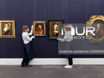 LONDON, UNITED KINGDOM - JUNE 27, 2025: Art handlers hold paintings painted in the same place, time and room over 400 years ago in Rome titled ''Self-portrait'' by Dirck van Baburen, estimate: GBP150,000 - 200,000 (L) and ''Self-portrait'' by David de Haen, estimate: GBP100,000 - 150,000 (R) during a photocall at Sotheby's auction house ahead of Old Masters Sale in London, United Kingdom on June 27, 2025.