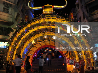India famous Ambassador Taxi is theme of 33 Pally's Sarbojanin Durga Puja Pandal of Beleghata area on October 06,2016 in Kolkata,India.The Hindustan Ambassador was an automobile manufactured by Hindustan Motors of India. It was in production from 1958 to 2014 with few improvements and changes over its production lifetime. The Ambassador is based on the Morris Oxford series 3 model, first made by Morris Motors Limited at Cowley, Oxford in the United Kingdom from 1956 to 1959.End of road for the iconic Ambassador car.