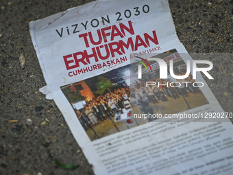 NICOSIA, CYPRUS - OCTOBER 21: An election leaflet for Tufan Erhurman, reading 'Vision 2023,' is seen on a pathway in the northern part of Nicosia, administered by the self-declared Turkish Republic of Northern Cyprus (TRNC) and recognized only by Turkey, near the United Nations-controlled buffer zone that separates it from the Republic of Cyprus-controlled south, on October 21, 2025. On 19 October 2025, Erhurman defeated incumbent president Ersin Tatar in the 2025 Northern Cypriot presidential election, winning 62.76% of the vote.