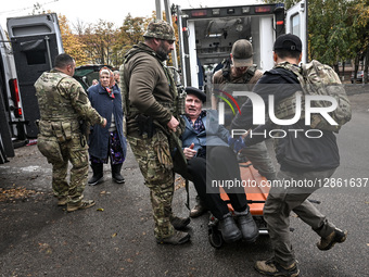 Volunteers load a 73-year-old mobility-impaired man, evacuated by the ''White Angel'' police special unit from the frontline village of Pidhavrylivka, located six kilometers from the line of combat, onto a stretcher for transport to an ambulance for further relocation to a transit center in the Dnipropetrovsk region, Ukraine, on October 9, 2025.