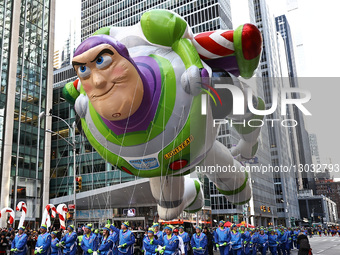 The Buzz Lightyear balloon from Pixar Animation Studios heads down the parade route during the 99th Macy's Thanksgiving Day Parade in New York, United States, on November 27, 2025. From head to ''ANDY'' adorned boot, the Buzz balloon is nearly as long as four Pizza Planet delivery trucks.