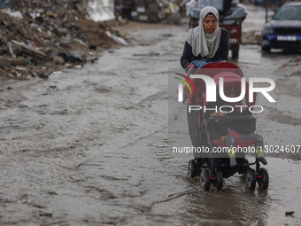 "A Palestinian woman walks under the rain in Gaza City, on No..."