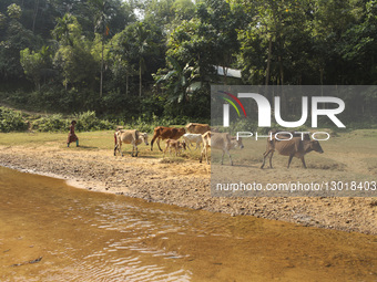 A child walks a cow to the field in an Indigenous village along the Bangladesh-India border in Netrokona, Bangladesh, on November 23, 2025.