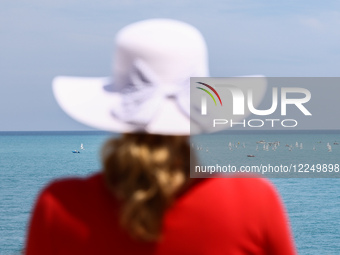 A woman watching yacht race in Antibes, France on May 19th, 2024.