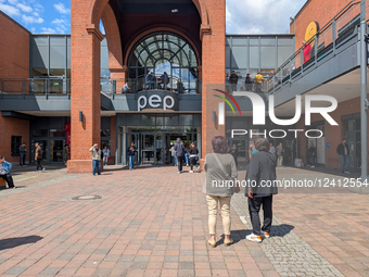 Shoppers and pedestrians gather at the entrance of the PEP shopping mall (Perlacher Einkaufs Passagen) in Neuperlach, a district of Munich, Bavaria, Upper Bavaria, Germany, on May 24, 2025. The mall is a major retail and social hub in southeastern Munich, featuring a wide range of stores, services, and eateries.