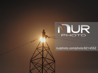A man sits on the top of a hi-tention electric poll , in Allahabad on November 24,2020.
