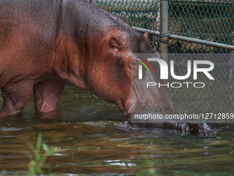 "A mother hippopotamus cares for her newborn calf at the Dehi..."