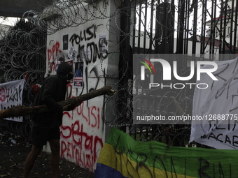 A protester carries a tree trunk during a protest in front of the DPRD building in Bandung, West Java, on August 29, 2025. Hundreds of civilians, including motorcycle taxi drivers, protest throughout Indonesia after the death of a driver who is run over by a police vehicle during a demonstration on the night of August 28.