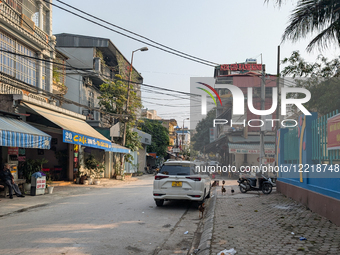 A quiet street is lined with small shops, cafes, and motorbikes, with chickens roaming freely on the sidewalk in Thanh Hoa, Vietnam, on April 1, 2025.