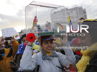 A woman holds a cage with a replica birdduring a protest against the Venezuelan government in Madrid, Spain, Tuesday, Feb. 18, 2014. At la Plaza de Colon in Madrid, Venezuelan protesters said 'no to censorship and repression' referring to the series of protests against Maduro's government that turned violent and caused three deaths last week and continue after 5 days in the South American country, Venezuela's President Nicolas Maduro once referred to a small bird as the reincarnation of former President Hugo Chavez.