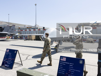 An AGM-114 Hellfire air-to-ground missile is displayed with a 5th generation F-35fighter jet in the background while US Air Force Military personnel is near, at the Paris Air Show 2025 at Le Bourget Airport. The Hellfire is developed by Lockheed Martin, a precision guided missile widely used by the U.S. and allied forces for anti-armor, close air support, and targeted strike missions. Originally designed for helicopter launch, the AGM-114 has been adapted for use on drones, fixed-wing aircraft, and naval platforms, making it one of the most versatile and effective missile systems in modern warfare. The Paris Air Show gathers major aerospace and defense manufacturers to showcase the latest technological advancements in aviation, weaponry, and space systems. Le Bourget Airport, Paris, France on June 18, 2025