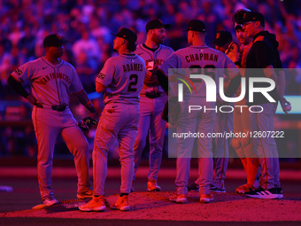 San Francisco Giants Manager Bob Melvin stands on the mound with players during a pitching change in the eighth inning of a baseball game against the New York Mets at Citi Field in Corona, N.Y., on August 1, 2025.