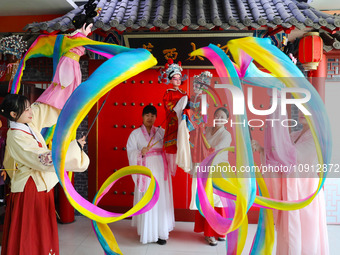 An actor from the Puppet Art Troupe is rehearsing a puppet show in Laixi, Shandong Province, China, on January 14, 2024.