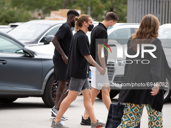 Antoine Griezmann Clement Lenglet and Samuel Umtiti arrives to Lionel Messi farewell press conference at Auditori 1899 at Camp Nou Stadium in Barcelona, Spain on August 8, 2021.